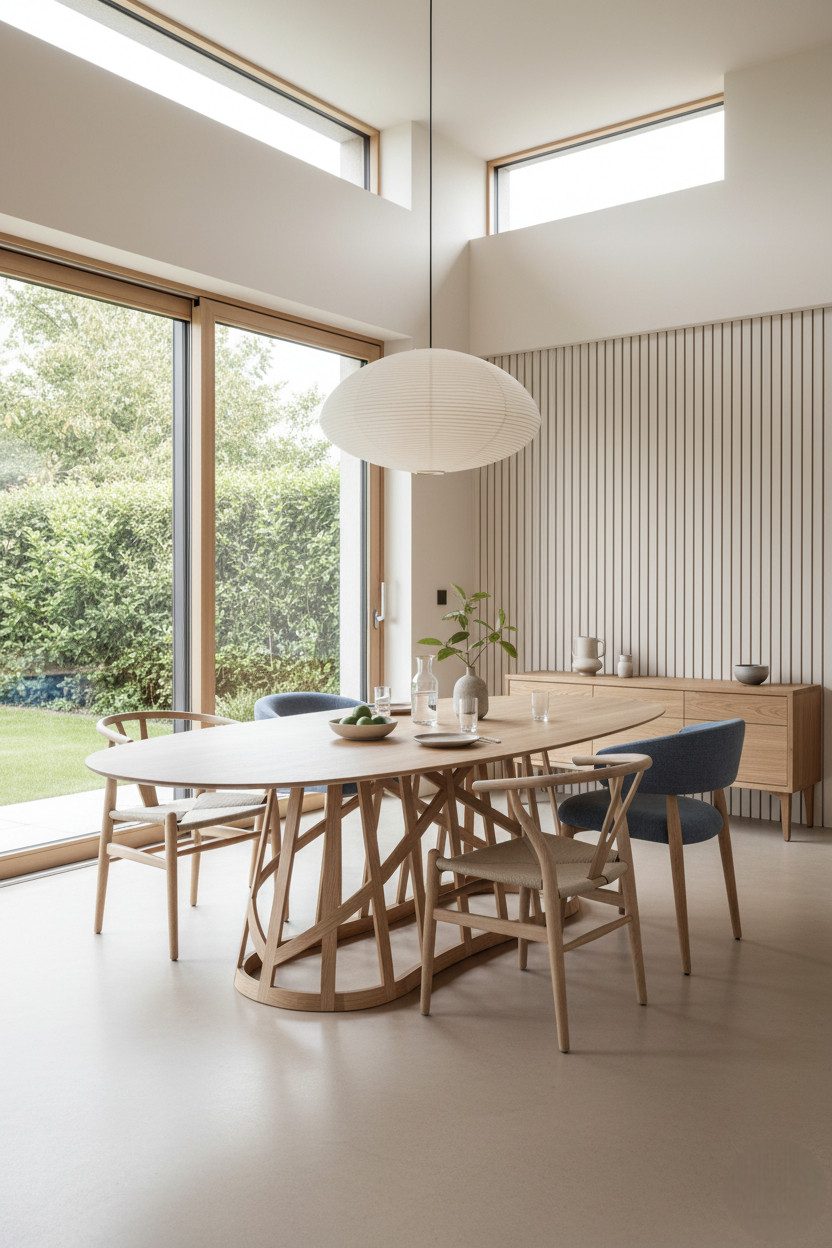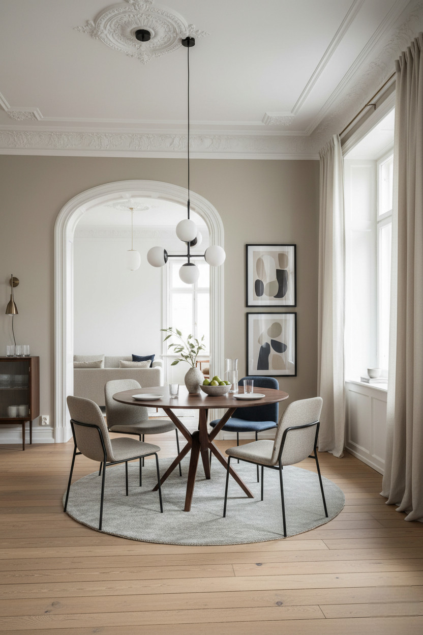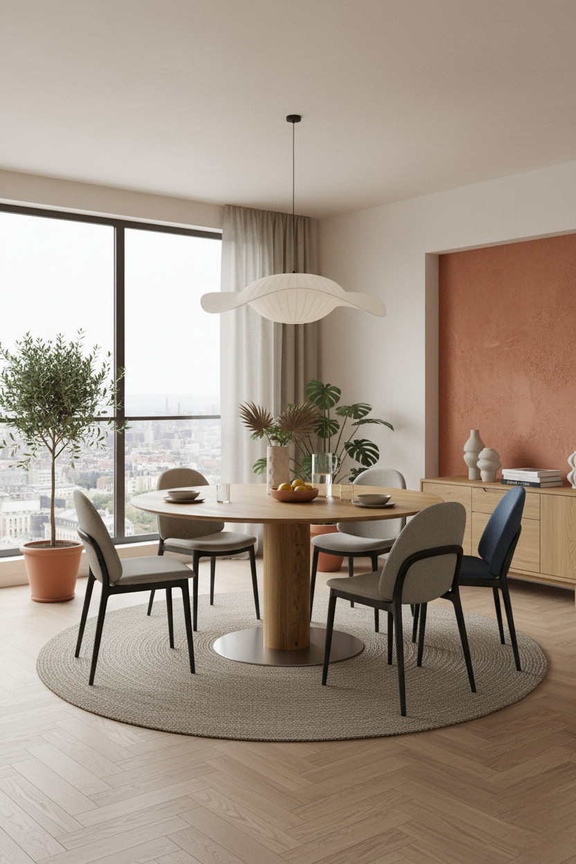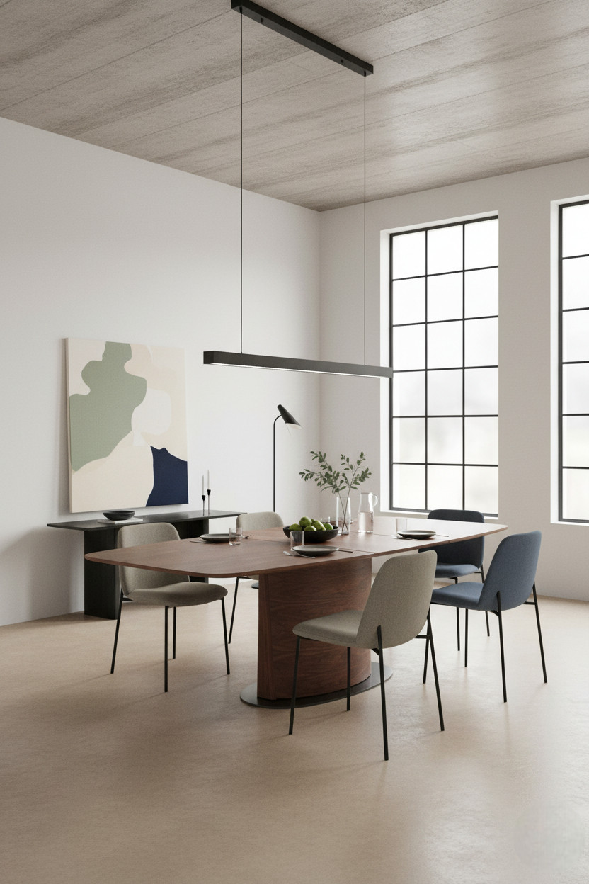 Tatsächlich kann die Kombination verschiedener Formen wieder auf subtile Art das Besondere herbeizaubern. Ergänzen Sie etwa eine oval gestaltete Lampe über dem Tisch und wählen sanft abgerundete Stühle anstelle eckiger Ausführungen, dann bleibt die klare Struktur zwar erhalten, das gesamte Ambiente taucht aber auch in mehr Weichheit ein.
